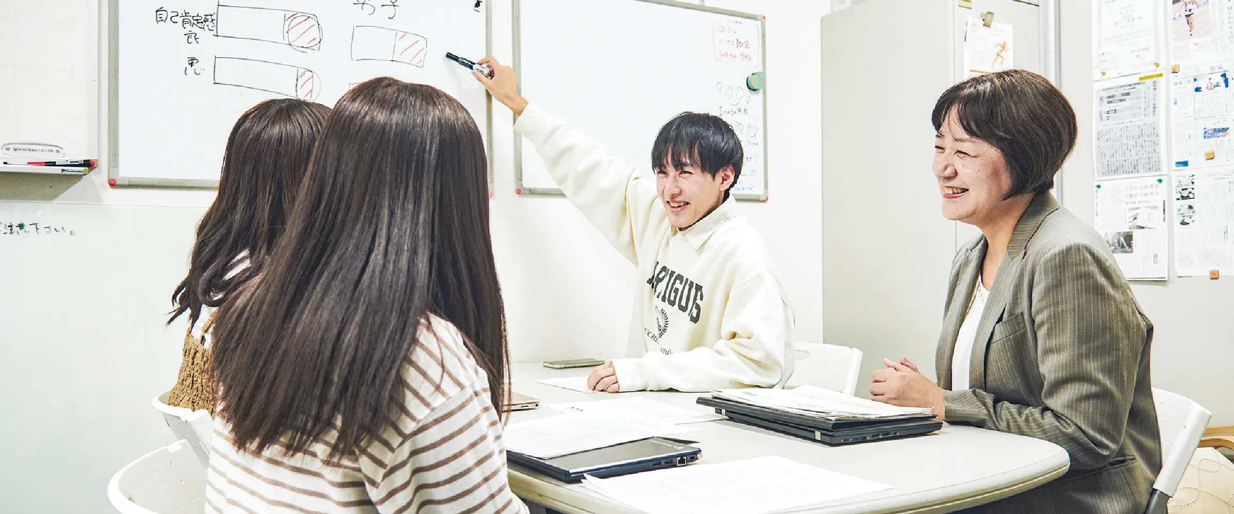 本ゼミでは、3つのテーマについて研究しています。1つ目は高「校生の食と健康」です。高校生の自己肯定感と健康に関する調査を行い、女子生徒の過剰なやせ願望についても検証しています。2つ目は「アスリートの補食摂取状況」です。女性アスリートは必要な栄養素をしっかり摂ることが重要で、3食以外にも補食が不可欠です。補食の摂取状況を調査し、栄養サポート方法の検討を行っています。3つ目は「共食」に関する研究です。食事を共にする人の発言によって味覚が変化する状況を踏まえ、共食のメリット・デメリットを追究しています。食から健康へのアプローチ方法を一緒に考えていきましょう。