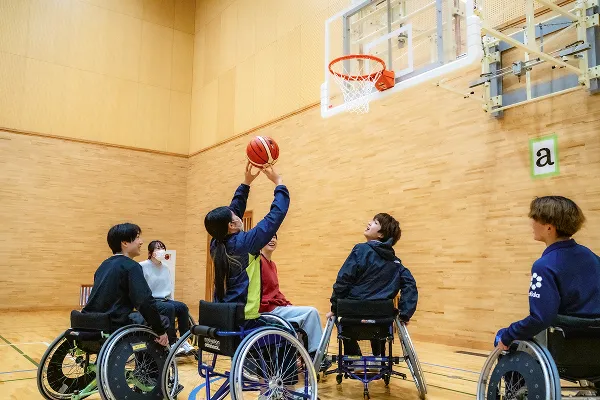 学科必修科目となる教養体育として、健康科学に関する基礎的な知識や技能を身につけるだけでなく、アダプテッドスポーツである車イスバスケットボールに実際に取り組むことでQOLサポーターとしての理解を深めることを目指します。