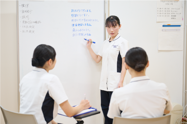 点滴対応中に他の患者様の検査や処置が重なったり、ケアを行っている際に他の患者様からの対応を求められるなど、臨床現場で起こりうるさまざまな状況を想定し、現場で適切に対処できるよう学びます。
