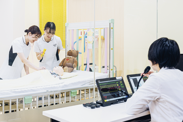 この科目では、モデル人形を用いて、点滴をしている子どもへの援助などの小児看護技術について学びます。また、大人と子どもの違いを理解し、検温などの場面を想定したシミュレーション演習を通して、子どもたちにスムーズに治療を受けてもらうための工夫についても学んでいきます。