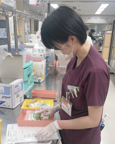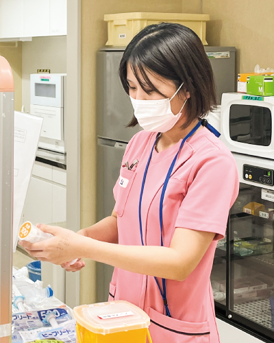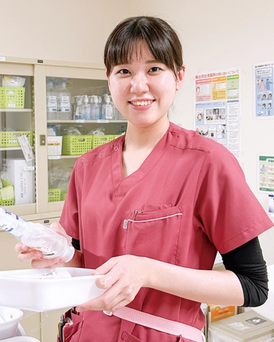 私は現在、産婦人科病棟で看護師として婦人科・小児科をはじめ、整形・呼吸器・消化器など様々な診療科の患者様が入院するチームで働いています。婦人科手術を受ける患者様の全身状態の観察、点滴管理、食事介助、体位交換などの日常生活介助など、少しでも快適に入院生活を送ってもらえるように支援しています。