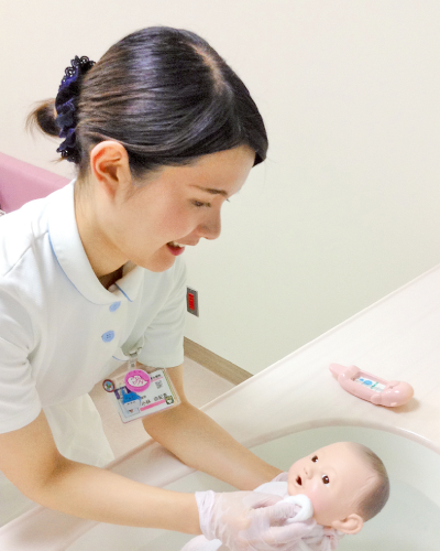 - 助産師は命の誕生に携わる魅力的な職業ですが、責任も大きく確かな知識と技術が求められます。本学では高性能シミュレータで実践的な学びができます。皆さんも本学で、他学科の学生と一緒にチーム医療を学びながら看護の素晴らしさを学んでください!
