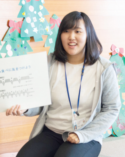 - 子どもの頃、友人関係や進路のことで学校の先生に相談に乗っていただき、たくさんお世話になりました。私も、これまで出会ってきた先生方のように一人でも多くの子ども達の力になりたいと思い、養護教諭を目指しました。そして、看護の知識を自信にして仕事をしたいと思い、養護教諭と看護師免許を一緒に取得できる本学に入学しました。