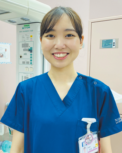 私は、産科病棟にて、病気を持った妊婦さんが高度な診療を受けながらも妊娠継続できるよう、治療の介助や心理面のケアを行っています。また、お産の時には安全に産めるよう産婦さんに寄り添い、産後には安心して楽しく育児が行えるよう、新生児の授乳や育児のお手伝いをしています。