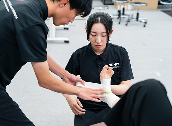 筋骨格系障害のうち、主に保存療法で対応する疾患やスポーツ外傷・障害に対する理学療法について学びます。筋骨格系障害に対する理学療法の総論、各組織の治癒過程、各疾患の病態について理解を深め、演習では、各疾患の病態・診断・評価・治療についてグループワークを通して発表・討論を行います。また、徒手検査・運動療法についての実技演習を通して専門知識および治療技術を実習し、臨床現場で役立つ知識や技術を習得します。