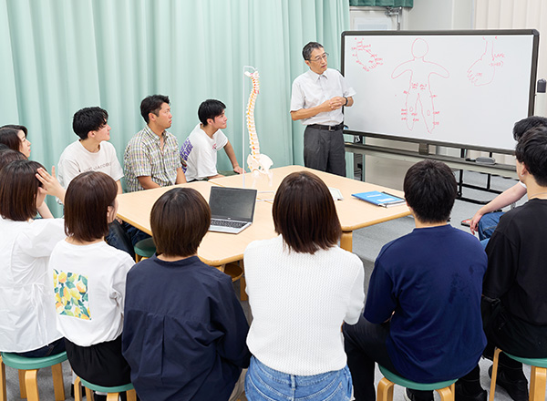 | 専門科目 | 講義系 | ●解剖学Ⅰ・Ⅱ・Ⅲ ●リハビリテーション概論 ●理学療法学概論 ●機能解剖学 ●基礎運動学 ●生理学Ⅰ・Ⅱ ●理学療法基礎評価学Ⅰ ●医療英語Ⅰ・Ⅱ ●理学療法基礎科学Ⅰ・Ⅱ ●教育学 ●教育心理学 ●教育方法綸 ●教育評価 |