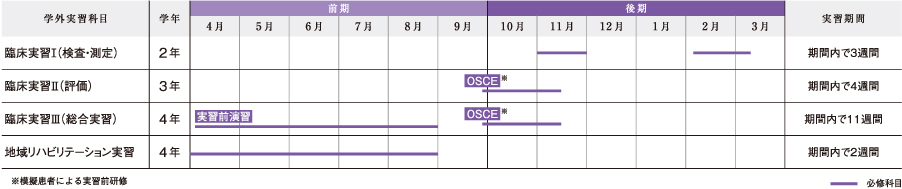 ●総合演習 ●臨床実習Ⅲ(総合実習) ●地域リハビリテーション実習 ●海外フィールド実習 ●応用肉眼解剖学実習 ●統計演習 |