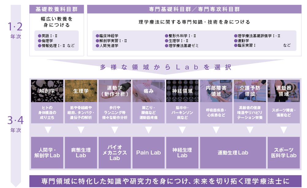 本学科では、理学療法の各専門領域を学ぶ9つの「Lab(研究グループ)」を設置し、学生は3年次から希望する「Lab」で研究を行います。「Lab」では、複数の教員からきめ細かな指導を受けることができ、各領域に特化した高度な研究を行うことができます。こうした活動は、理学療法士養成校の中で日本一の教員数を誇る本学だからこそ可能な取り組みです。今後も本学科では、「Lab」活動を通じて、高度な知識と技術を有した理学療法士の育成に尽力していきます。