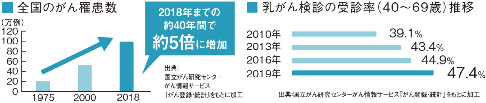 超高齢化社会の発展などにより、がんの診断件数は年々増加しており、がん治療におけるCT検査やMRI検査などの画像検査や放射線治療の重要性が高まっています。また女性に多い“乳がん”の早期発見で有効なマンモグラフィ検診率も近年増加しています。こうした状況を受け、重大な病気の発見・検査から治療まで幅広い業務に対応することができる診療放射線技師へのニーズは、今後ますます高まることが予想されます。