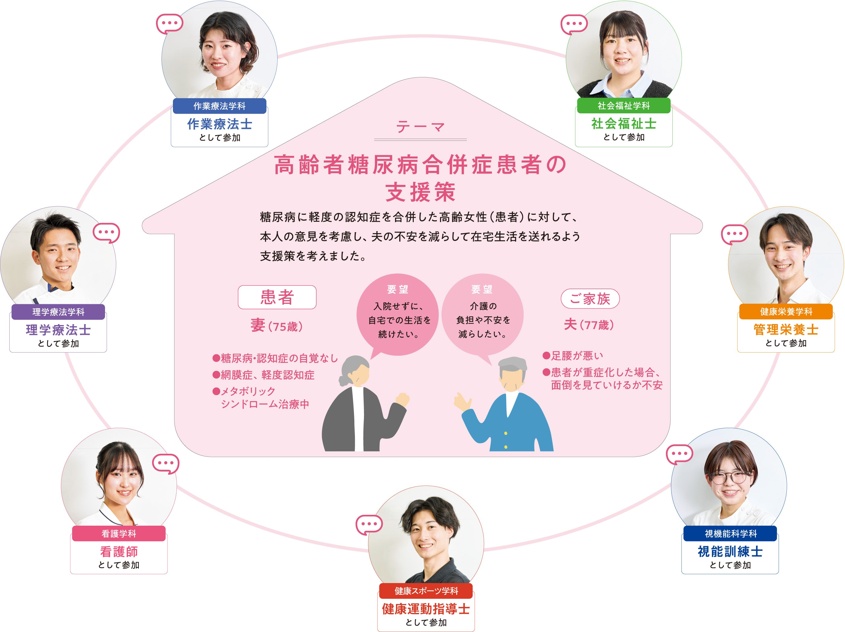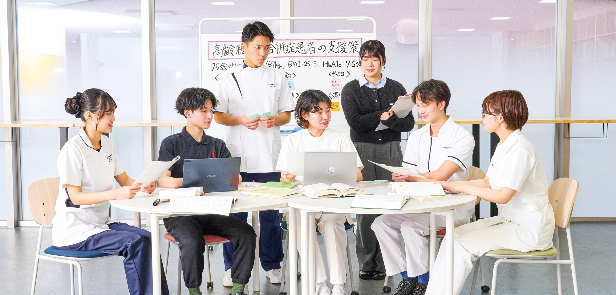 本学の特徴的な取り組みの一つである「連携教育」の一環として、3年次後期と4年次前期に開講されるゼミです。他学科の学生と混成で一つのチームを形成し、具体的な症例をもとにグループワークを通じて支援策を検討します。これまで学内外で修得した専門知識・技術を活用し、他学科の学生と協働して課題に取り組むことで、将来「チーム医療・ケア」の現場で必要となる関連職種への理解やチームワーク技法について実践的に学ぶことができます。