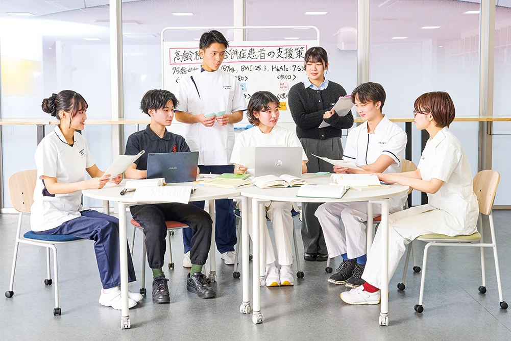 これまで学内外で修得した専門知識・技術を総動員し、チーム医療などについて実践的に学んでいきます。ゼミでは、具体的な症例をもとに、関連する学科が混成でグループを形成し、グループワークを通じて具体的な支援策について意見交換を行い、検討結果を発表します。
