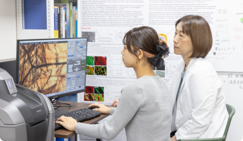 共焦点顕微鏡やオールインワン蛍光顕微鏡などの最新の解析機器を用いて組織の構造を解析します。鍼灸刺激を受け取る分子や疾患に関連する受容体に関する基礎研究を行います。