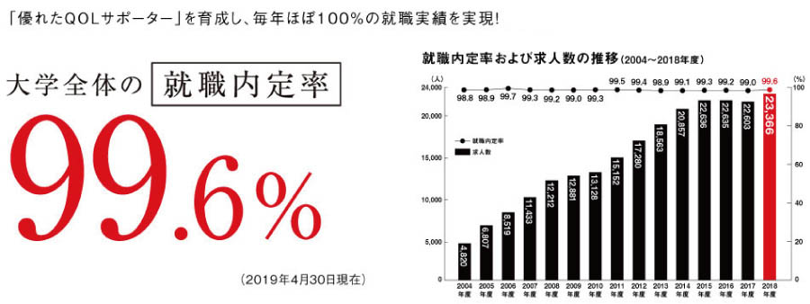 本学で身につける確かな知識・技術と高い実践力、そして「連携教育」で培った関連職種への理解と高いコミュニケーション力は、病院などの医療機関や福祉施設をはじめ、あらゆる現場から高い評価を受け、本学への求人数も23,000人以上で推移しています。景気の動向に左右されることなく、高い就職実績を維持するための環境が本学には備わっています。