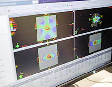 放射線治療の多くは体の外から照射する外照射法が用いられます。がんが肉眼で見えない中、がんに多くの放射線を集中する方法などの開発、研究をすることにより、疾患によっては外科療法と同等の治療成績も得られます。また体や臓器の形態や機能が失われることが少なく、全身への負担が少ないのも特徴であり、高齢者や子どもにも貢献できる治療法です。