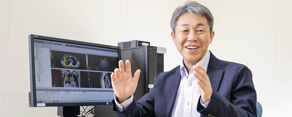 がんの治療法には、手術などの「外科療法」、抗がん剤治療などの「化学療法」、そして「放射線療法」と大きく3本の柱から成っています。その中でも「放射線治療」は切らずにがん治療を行う治療法として注目され、国内でもこの治療を選択する患者さんは増加しています。切らずに行うということは直接がんは見えません。そこで、CTやMRIを使用しがんの位置や大きさを確認しています。特にその中でも、主に呼吸で動くがんに対して正確に放射線治療できるような研究を行っています。