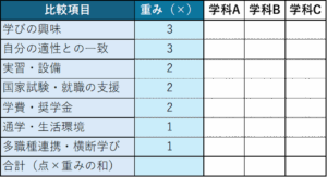 以下の表を参考に、候補大学・学部学科を点数化(1~5点)。重み付けをして合計点で比較。