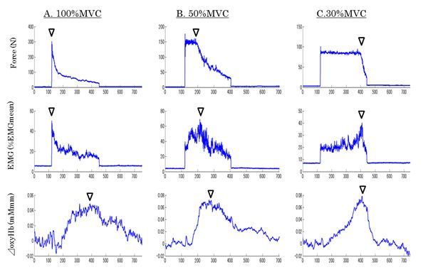我々はこの装置を利用して,筋収縮継続中の筋活動と発揮張力,大脳皮質酸素化ヘモグロビン変化量を同時に計測し,筋疲労と大脳皮質活動との関係を研究している.図は100%,50%,30%MVC把持課題継続中の把持力・手指屈筋群の筋活動・NIRS信号(Oxy-Hb)の変動を示している.図に示すように,強い強度での筋収縮時には,筋活動が低下しても大脳皮質の活動はしばらく低下せず,弱い強度での筋収縮時には,筋活動が低下する時期と脳活動が低下する時期がほぼ同時であることが明らかとなった(岩部ら,2009).