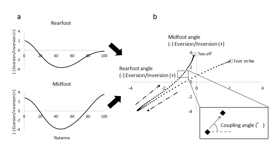 図3 後足部と中足部のangle-time plot(a)からcoupling angle(b)を算出