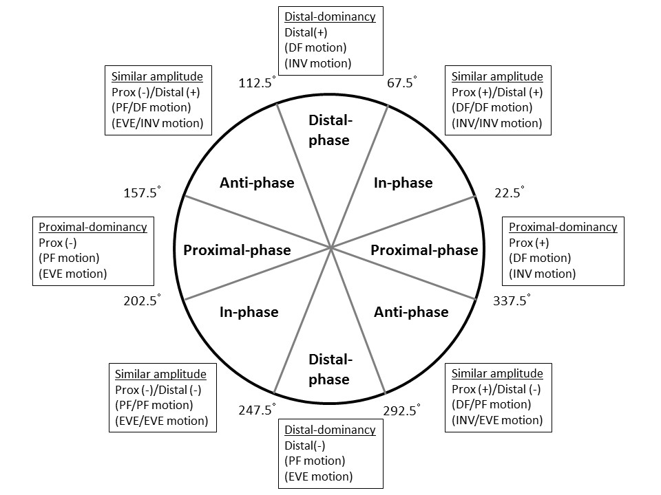 Distal-phase; 遠位セグメントが優位に動く,Proximal-phase; 近位セグメントが優位に動く,Anti-phase; 各セグメントが同等の運動量で逆方向に動く,In-phase; 各セグメントが同等の運動量で同じ方向に動く.