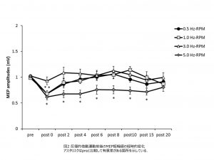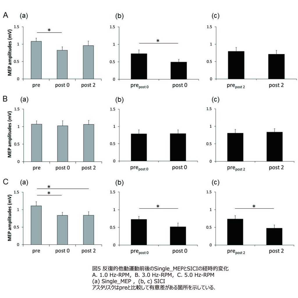 ①我々は,皮質脊髄路の興奮性を評価するために運動誘発電位(MEP)を用いました.他動運動課題は10分間の反復示指外転運動とし,0.5,1.0,3.0,5.0 Hzの運動頻度を用いました(0.5,1.0,3.0,5.0 Hz-RPM).その結果,0.5,1.0 Hz-RPMでは,介入前と比較してMEP振幅値が2分間有意に低下しました.一方,3.0 Hz-RPMでは有意な変化を認めませんでした.さらに,5.0 Hz-RPMでは,介入前と比較してMEP振幅値が15分間有意に低下しました.このことから,反復的他動運動は運動頻度に依存して皮質脊髄路の興奮性を低下させることが明らかになりました.