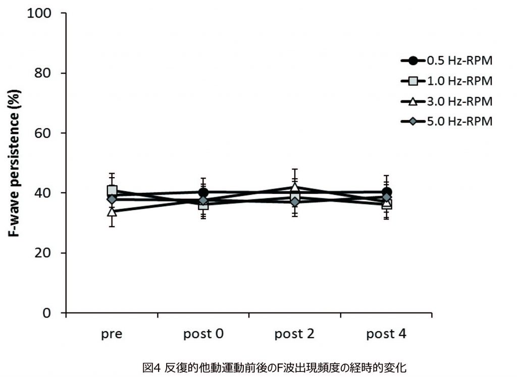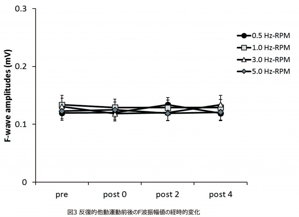 ②我々は,脊髄運動ニューロンの興奮性を反映するF波を用いて,反復的他動運動後のMEP変化は一次運動野または脊髄運動ニューロンのどちらの興奮性が変化しているのかを検討しました.その結果,いずれの運動頻度においてもF波振幅値とF波出現頻度は変化しませんでした.この結果は,反復的他動運動後に観察されたMEPの低下は,脊髄運動ニューロンの興奮性変化ではなく,一次運動野で引き起こされていることを示唆しています.