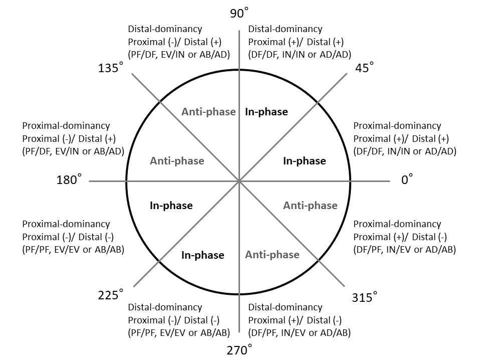 ②立脚初期においてin-phase with distal dominancy(中足部は後足部より回内の動きが優位)の割合が多かった点.