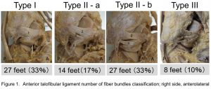 足関節を捻挫した際に頻回に損傷する靭帯に前距腓靭帯があります。その前距腓靭帯には4つのタイプがあることを明らかにしました。タイプⅠは前距腓靭帯が1本のもの、タイプⅡ-aは前距腓靭帯が2本であり不完全に分離しているもの、タイプⅡ-bは前距腓靭帯が2本であり完全に分離しているもの、タイプⅢは前距腓靭帯が3本のものです。タイプⅡやタイプⅢでは靭帯の長さや走行角度が異なるため、足関節の制動機能が異なる(捻挫をしやすい)可能性が考えられました。