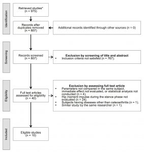 そこで、この要因を探索するためにシステマティックレビューを行いました(図2)。その結果、975本の論文のうち10本の論文が選定基準をクリアし、歩行時の「足関節のプッシュオフ」や「体重免荷」が股関節モーメントインパルスを低減させる要因であることが明らかになりました。本研究は、「Gait & Posture」に掲載予定です。