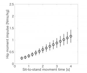 変形性股関節症は、股関節の軟骨に変性や摩耗が生じる代表的な整形外科疾患です。近年、前額面と矢状面上の股関節累積負荷(=股関節モーメントインパルスと1日あたりの平均歩数の積)の増大が変形性股関節症の進行を助長すると報告されています。すなわち、股関節モーメントインパルスが低減された動作を解明することは、変形性股関節症の進行を予防するための基礎的知見になる可能性があります。本研究では、「立ち上がり動作の時間(すなわち速度)」と「矢状面上の股関節モーメントインパルス(すなわち股関節屈曲・伸展モーメントインパルス)」に着目し、これらの関係を実験データ(参加者:20名)およびコンピューターシミュレーションを用いて検討しました。その結果、立ち上がりの時間が短い(速度が速い)ほど、矢状面上の股関節モーメントインパルスが小さくなることが明らかになりました(図1)。本研究は、『BioMedical Engineering OnLine』に掲載予定です。