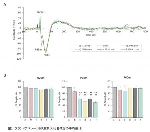 一次体性感覚野の抑制機能を評価する指標の一つに,末梢神経を二連発刺激した際に記録される皮質反応(Paired pulse depression,PPD)があり,精神疾患や年齢と関連することがわかっています.しかし,PPDは健常若年者においてもバラツキが大きく,人によってはPPDがみられないことがあります.そもそも,PPDは安定した評価指標なのか?個人間の違いはどのような要因によって引き起こされるのか?という疑問を解決することを目的として研究を行いました.