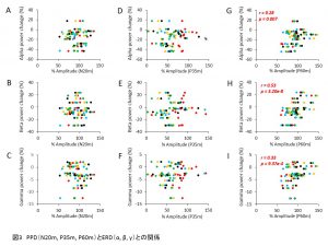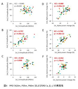 その結果,3種類SEF成分(N20m,P35m,P60m)のうち,P35mとP60mにおいてはPPDが認められることと(図2),末梢神経刺激による事象関連脱同期の大きさとP60mのPPDの大きさに相関関係が認められ,β帯域のERDが大きい人ほどPPDが大きい(抑制機能が強い)ことが判明しました(図3).また,P35mのPPDの再現性は高く,N20mやP60mのPPDの再現性は低いことと,α,β,γ帯域のERDの再現性はいずれも高いことが判明しました(図4).さらに,BDNF遺伝子多型はPPDの大きさに影響しない可能性が高いこともわかりました.