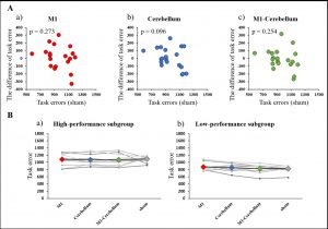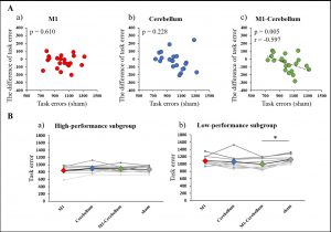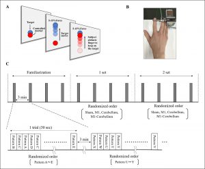 人の運動遂行機能を向上させるための最適な脳刺激法は十分にわかっていません。私たちの研究グループは、運動に関与する脳領域である一次運動野(M1)と小脳領域を交流電流により刺激することで、刺激中に手指の巧緻動作が向上することを発見しました。またこの効果は運動が巧くない人ほど効果が認められました。