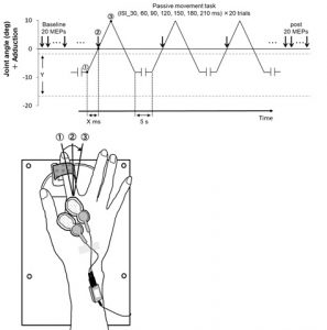 体性感覚入力は,一次運動野の興奮性に影響を与えることが明らかになっております.末梢神経電気刺激を用いた研究では,電気刺激後の20-30 msで一次運動野の興奮性が低下し,40-80 msにて一次運動野の興奮性が増大することが報告されています.しかし,運動によって誘発される体性感覚入力は,一次運動野の興奮性にどのような影響を及ぼすのかは不明です.そこで本研究では,他動運動で生じる体性感覚入力が一次運動野の興奮性に与える影響を明らかにすることを目的としました.