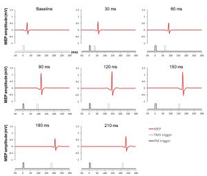 図2.ISIに依存したMEP変化.BaselineのMEP波形と比較してISI_90,120,150 msでのMEP波形が大きくなっている.