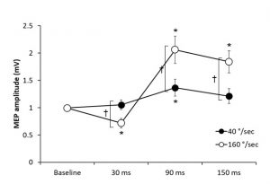 図4.他動運動の角速度に依存したMEP変化.40°/secと160°/secの他動運動では,各ISIにおいて有意差が認められた(p < 0.05).40°/secの他動運動では,Baselineと比較してISI_90 msのみでMEP振幅値の有意な増大を認めた(p < 0.05).また,160°/secの他動運動では,Baselineと比較してISI_30 msでMEP振幅値の有意な低下が認められ(p < 0.05),ISI_90,150 msでMEP振幅値の有意な増大を認めた(p < 0.05).アスタリスクはBaselineのMEP振幅値と比較して有意差があることを示す.ダガーは40°/secと160°/secの各ISIで有意差があることを示す.
