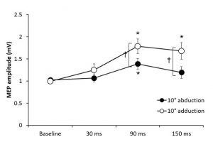 図5.他動運動の関節角度に依存したMEP変化.外転10°と内転10°のISI_90,150 msのそれぞれにおいて有意差が認められた(p < 0.05).外転10°の磁気刺激では,Baselineと比較してISI_90 msのみでMEP振幅値の有意な増大を認めた(p < 0.05).また,内転10°の磁気刺激では,Baselineと比較してISI_90,150 msでMEP振幅値の有意な増大を認めた(p < 0.05).アスタリスクはBaselineのMEP振幅値と比較して有意差があることを示す.ダガーは外転10°と内転10°の各ISIで有意差があることを示す.