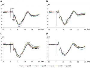 これらのSEP波形は,各RPM介入(0.5,1.0,3.0,5.0 Hz-RPM)前後でC3’(Fz)から導出された全体平均(n = 15)である.