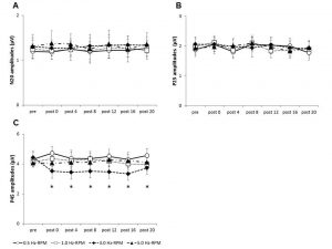 図4.A):N20振幅値,(B):P25振幅値,(C):P45振幅値.RPM介入(0.5,1.0,3.0,5.0 Hz-RPM)前後の各区間(pre,post 0,post 4,post 8,post 12,post 16,post 20)で記録したN20,P25,P45成分の平均値 ± 標準誤差である(n = 15).*:p < 0.05.