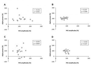 これらの図は,各RPM介入前後のP45成分の変化率(%)とAlpha powerの変化率(%)の関連性の結果を示している.その結果,P45成分の変化率とAlpha powerの変化率には有意な相関関係は認められなかった.