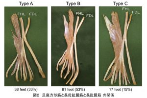 TypeA:長母趾屈筋が第2指へ分岐,TypeB:長母趾屈筋が第2・3指へ分岐.