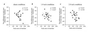 ベースラインのエラーが大きい人(運動が下手な人)ほど、M1小脳へのtACSによってエラーが低下する(運動が上手くなる)関係性が認められた。この関係性は1 mA、2 mAどちらの刺激強度においても認められた。