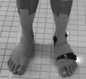 1. テーピングを用いてスイマーの足関節の柔軟性を制限し(図1)、その前後で水中ドルフィンキック泳速度を比較すると、泳速度は低下することを確認しました。