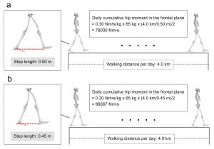 ①歩幅の違いは股関節累積負荷に影響を与えるため、股関節モーメントインパルス(Nms/kg)を歩幅(m)で正規化した点(歩幅で正規化することにより、間接的に股関節累積負荷の変動を観察することが可能)。