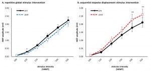 指先への触覚刺激は,指先の感覚機能を向上させることが報告されています.さらに,その刺激のパターンによって,脳の活動は異なることが示されています.そこで我々は,刺激のパターンを変えることで介入の効果が異なるのではないかと推測し,触覚刺激の刺激パターンが運動を司る大脳皮質領域(一次運動野)の興奮性と運動機能に及ぼす影響を明らかにすることを目的に研究を行いました.その結果,指先全体を同時に刺激する条件では,一次運動野の興奮性が減弱しました.一方,指先を左から右に刺激が移動する条件では,一次運動野の興奮性が増大し,さらに指先の運動機能の向上が認められました.本研究によって,触覚刺激の介入効果は刺激パターンによって異なることが明らかになりました.