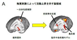 脳卒中後の後遺症の一つである病的な痛みには有効な薬がなく,臨床上の大きな問題となっています.この原因として,異常な痛みを生じさせる神経のメカニズムが良くわかっていないことがあげられます.そこで我々は,ヒトによく似た脳構造をもつ霊長類(マカクサル)を対象に,病的な痛みに関わる脳活動の変化を機能的磁気共鳴画像法(fMRI)を用いて調べました.その結果,主に痛みの情動に関わる領域(島皮質や前部帯状皮質)において,異常な脳活動の上昇が確認されました.さらにこれら過活動を薬理的手法を使って抑制すると,痛みを示す行動が減少することを発見しました.本研究によって脳卒中後に生じる異常な脳活動と痛みには因果関係が存在することが明らかになりました.