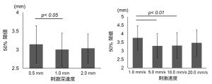 上記の方法を用いることで,被験者の最大限の二点識別覚パフォーマンスを反映する測定刺激速度(5.0 mm/s,10.0 mm/s)および刺激深達度(1.0 mm)を明らかにしました(50% 閾値の値が小さいことが二点識別覚が良いことを意味します).さらに,同条件での測定であれば,繰り返しの測定においても二点識別覚に変動は認められず,安定した測定結果が得られることが明らかになりました.