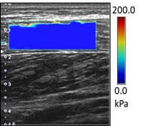 研究で使用した超音波画像診断装置の画像の一つです.この機能で筋に伝わるせん断波の速度から筋の硬さである弾性率を算出し,その弾性率を指標としてストレッチングの効果を検討しました.