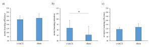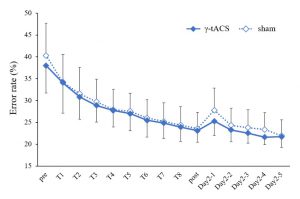 ② 一次運動野と小脳を同時刺激しながら視覚追従課題を練習するγ-tACS条件と刺激せずに練習する疑似刺激条件の2条件を用いて運動学習効率および運動学習の保持を比較しました.図では,γ-tACS条件において練習日の翌日の1回目におけるエラー値が疑似刺激条件よりも小さい(より学習が保持されている)ことを示しております.