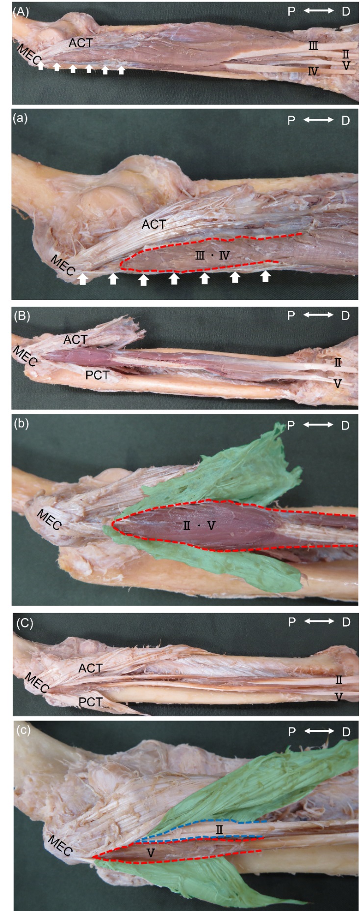 (C)(c)2指,5指の起始部が異なる構造.ACTと連続する腱から筋線維が起始し2指の停止腱(青線),ACT,PCT,AOL,その他の軟部組織から起始した筋線維が5指の停止腱となる(赤線)Type(2/20肘).3・4指をACT,PCTから丁寧に剥離し(緑色),ACTとPCTを反転させた.