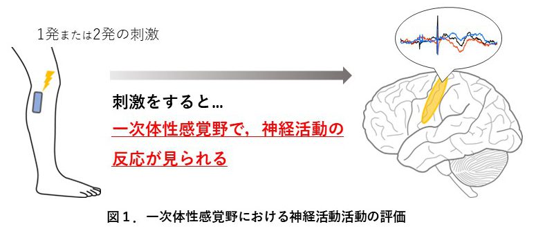 本研究では,女性被験者の月経周期を把握して,卵胞期・排卵期・黄体期の3期に実験を行いました.まず,一次体性感覚野の興奮性や抑制性の活動を調べるために,下腿の神経に1発または2発の電気刺激を与えて,刺激に対する一次体性感覚野の反応を評価しました(図1).